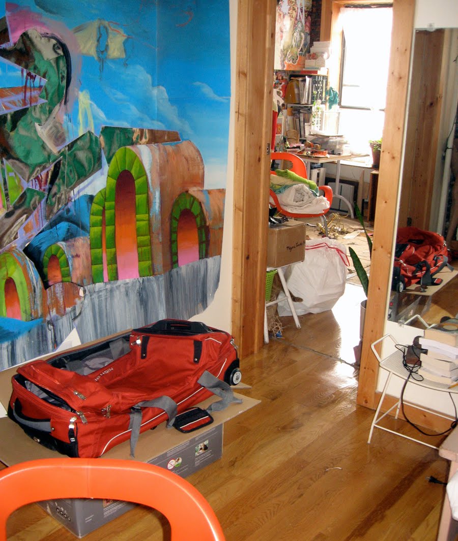 I'm leaving for Vermont on Tuesday. I have some serious packing to do. It's funny to decide what to bring for 7 weeks away from home. I am hoping to pack it all in that orange suitcase and the box under it giving priority to art supplies. My mom pointed out recently that I have no problem wearing items of clothing that I like over and over again so that takes care of that. I just have to make sure I have something to wear when I give artist talks and things to wear to make art in and do yoga. No problem ;-)